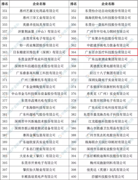 【企業新聞】喜訊!百合醫療榮登“廣東省制造業500強”榜單