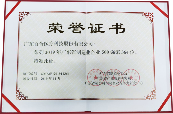 11月13日下午, 2019廣東省制造業發展年會暨廣東制造業500強企業峰會在廣州隆重舉行,百合醫療憑借卓越的實力榮登“2019年廣東省制造業企業500強”榜單。