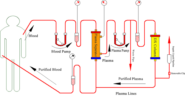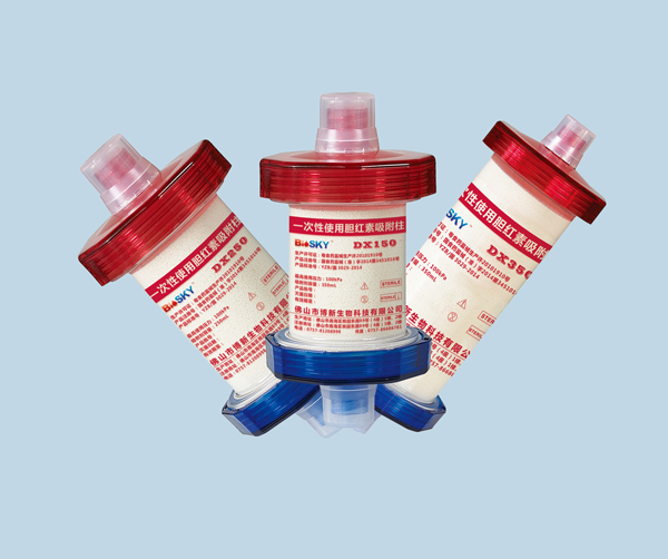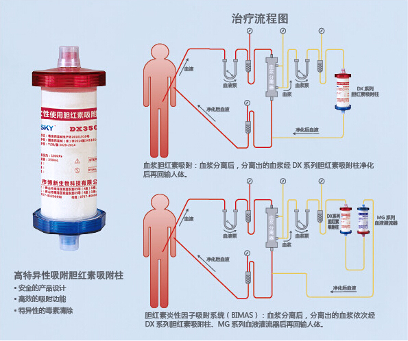 DX系列一次性使用膽紅素吸附柱(以下簡稱DX吸附柱)利用血漿分離器和血液凈化支持系統,將高膽紅素血癥、高膽汁酸血癥患者的血液引出體外,經血漿分離器分離出血漿,進行血漿吸附,清除患者體內的膽紅素和膽汁酸,達到凈化血液的治療目的。