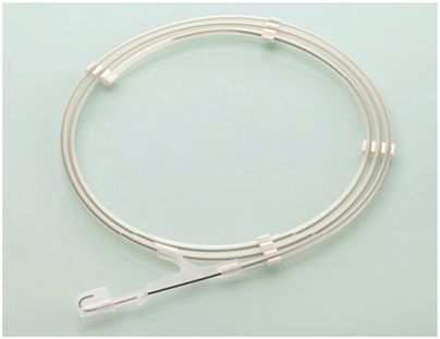 3.涂層導(dǎo)絲由不銹鋼內(nèi)芯和外層螺旋狀纏繞內(nèi)芯的不銹鋼絲圈兩部分組成。這種結(jié)構(gòu)可使涂層導(dǎo)絲有較強(qiáng)的彈性和韌性,利于它在血管內(nèi)各種方向彎曲而不致折斷;